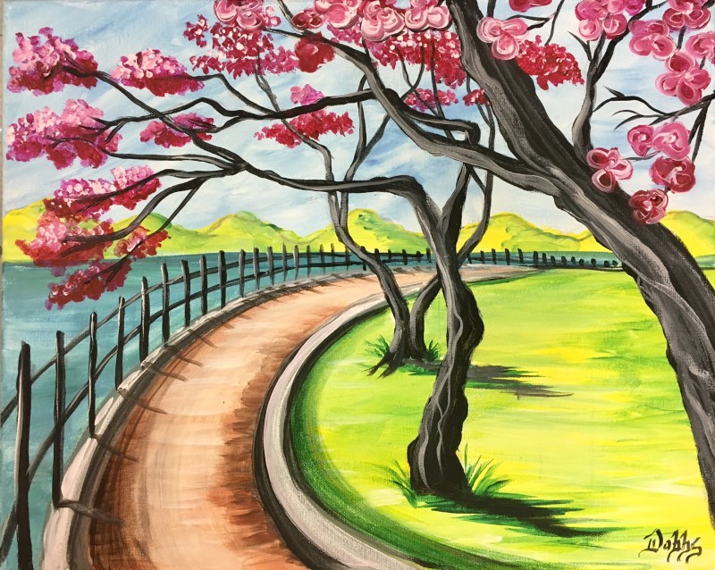 Painting of a cherry blossom tree-lined path by water, bright spring colors